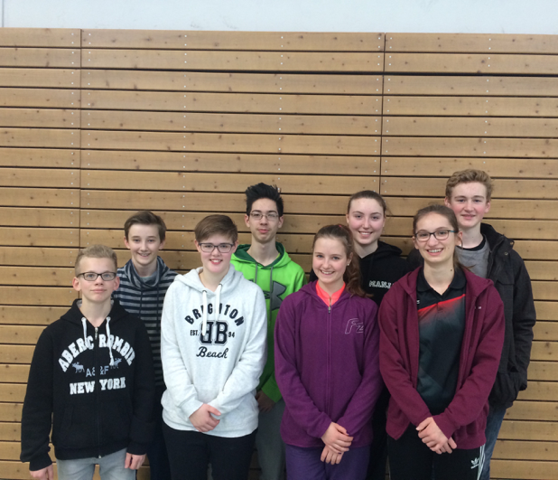 Jule Ubben, Tara Oldhaver, Manja Oldhaver, Tom Scheefe, Max Schedelgar, Haitao Aye, Jonas Buck (alle TSV Schwarzenbek), Amrei Dmoch (Büchen-Siebeneichener SV) sowie Trainer Moritz Naß und Sportlehrer Herr Brna (nicht im Bild)
