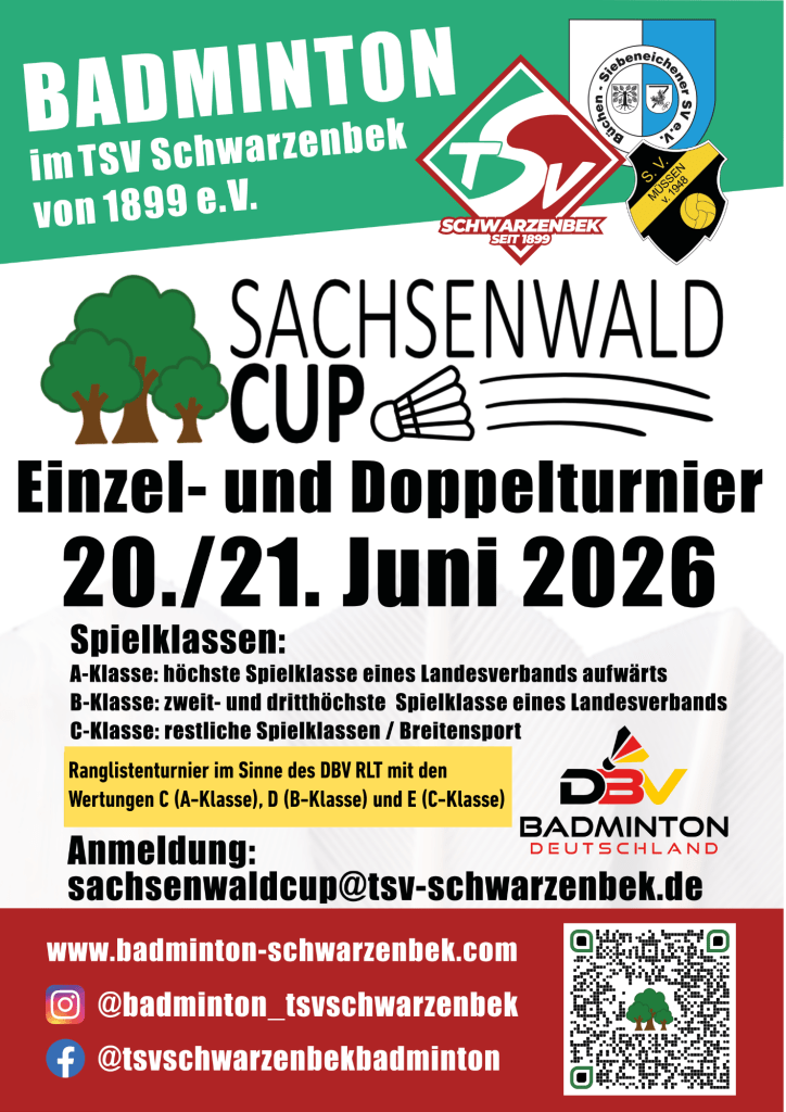 Der Sachsenwald-Cup findet in diesem Jahr zum dritten Mal statt. Ausgerichtet durch die Spielgemeinschaft der Vereine TSV Schwarzenbek, Büchen-Siebeneichener SV und SV Müssen treffen sich Spielerinnen und Spieler aller Leistungsklassen, um in den Doppeldisziplinen Damendoppel, Herrendoppel, Mixed, Dameneinzel und Herreneinzel die Plätze auszuspielen und dabei vor allem viel Spaß zu haben.